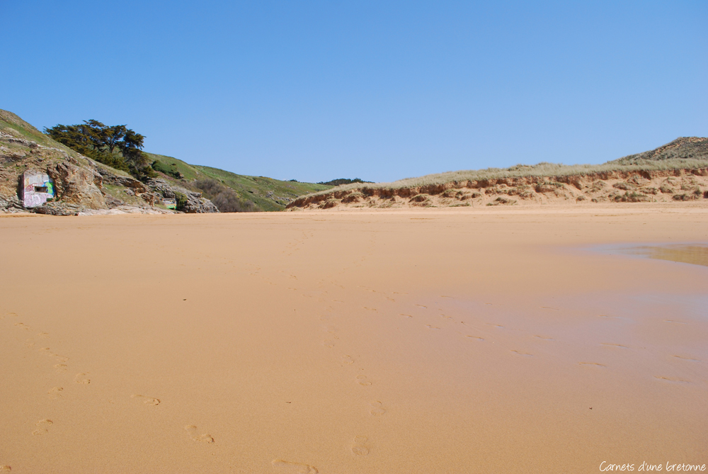 La plage de Donnant, haut spot de surf des bellilois, est accessible après quelques minutes de marche dans la dune. Sauvage et véritable site naturel, cette plage à marée basse est immense !