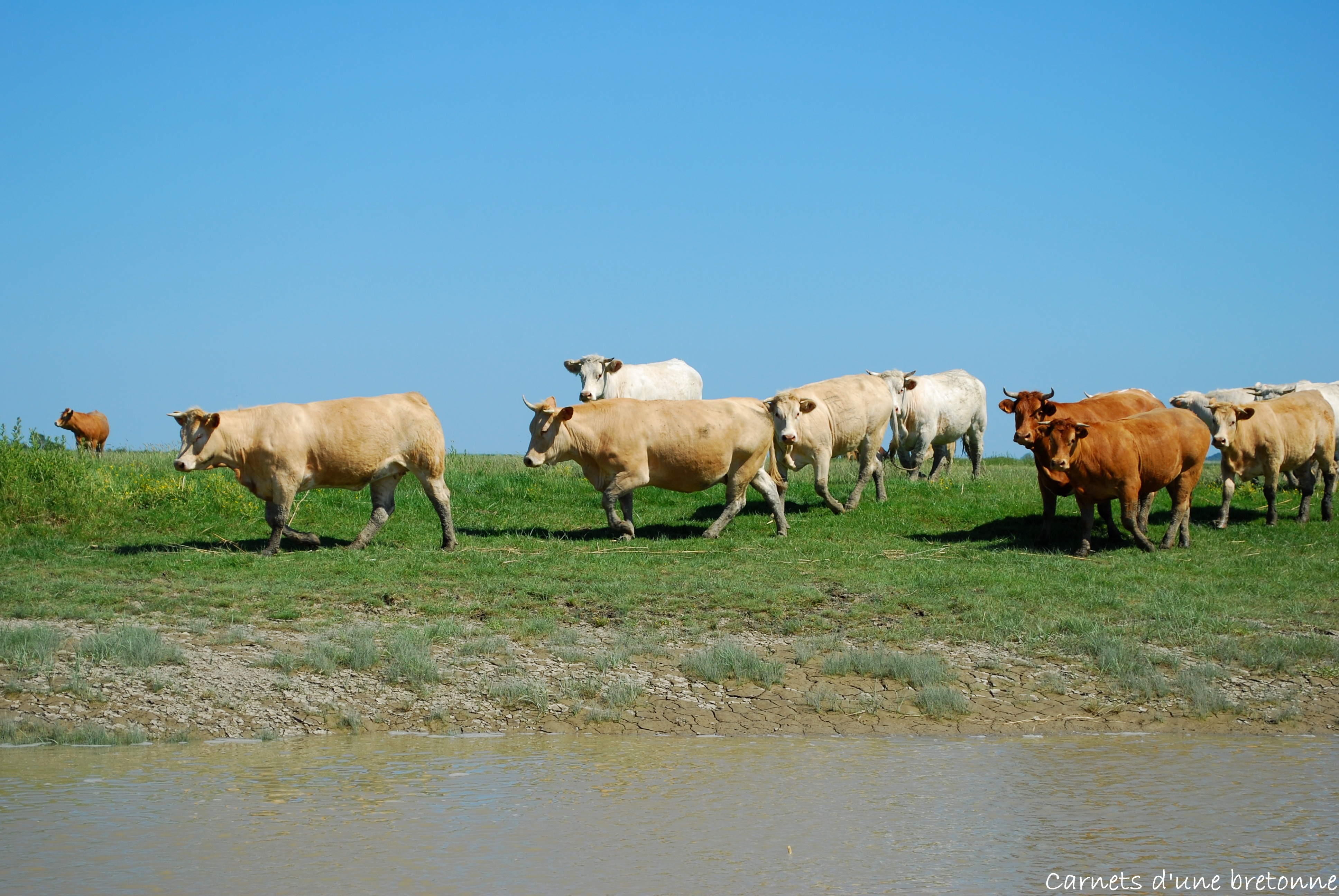 La météo étant chaude ce jour là, la fraîcheur de l’eau nous a ravit le temps de la traversée. Après quelques minutes en bateau, nous arrivons à la hauteur d’une prairie où paissent tranquillement plusieurs vaches. Intriguées voire excitées par notre passage, celles-ci sont venues nous dire bonjour… en courant ! Heureusement l’eau les a vite arrêté !