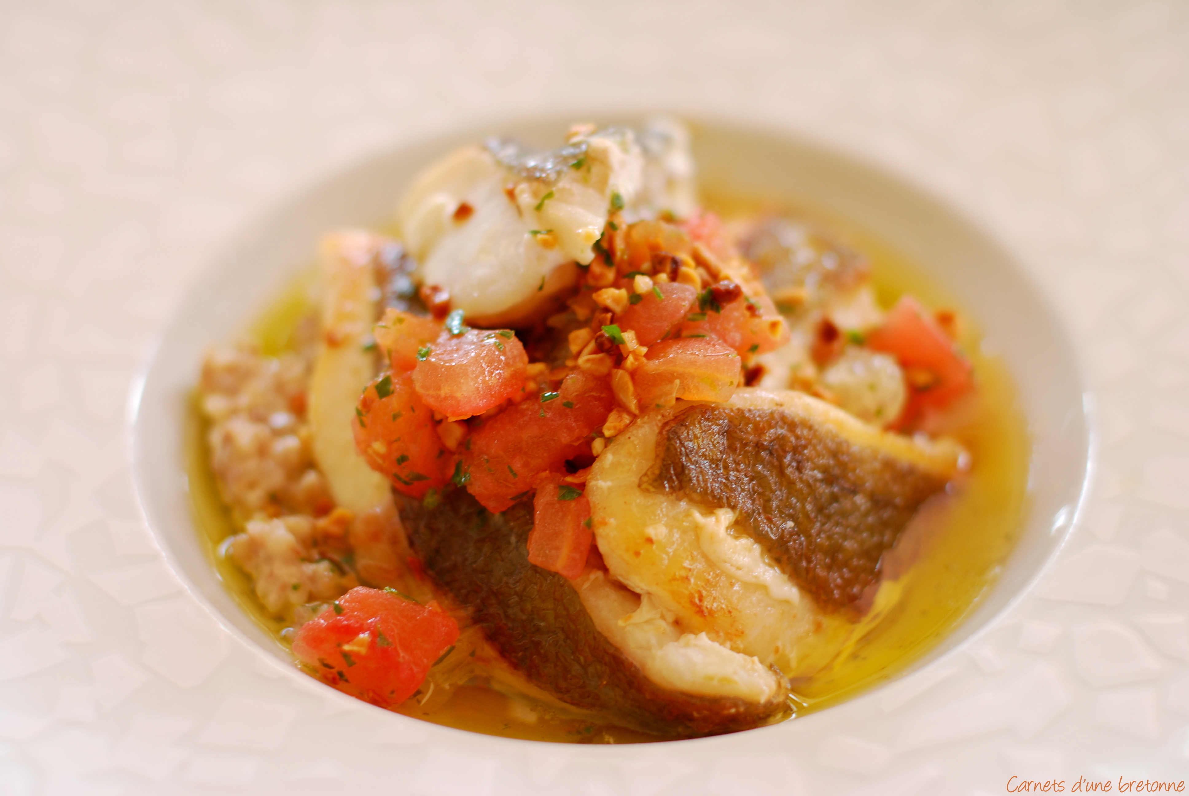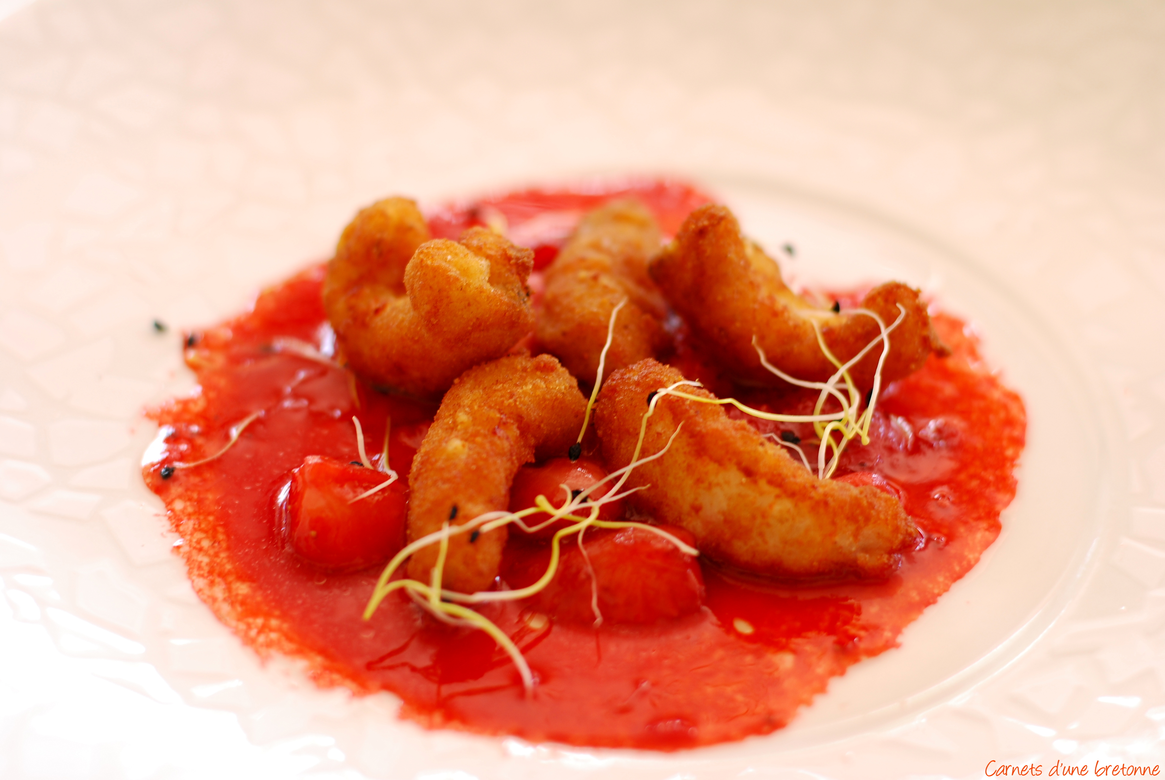 Croustillants de langoustine, marmelade de fraises et vinaigre balsamique – Filet de St Pierre et risotto de sarrasin