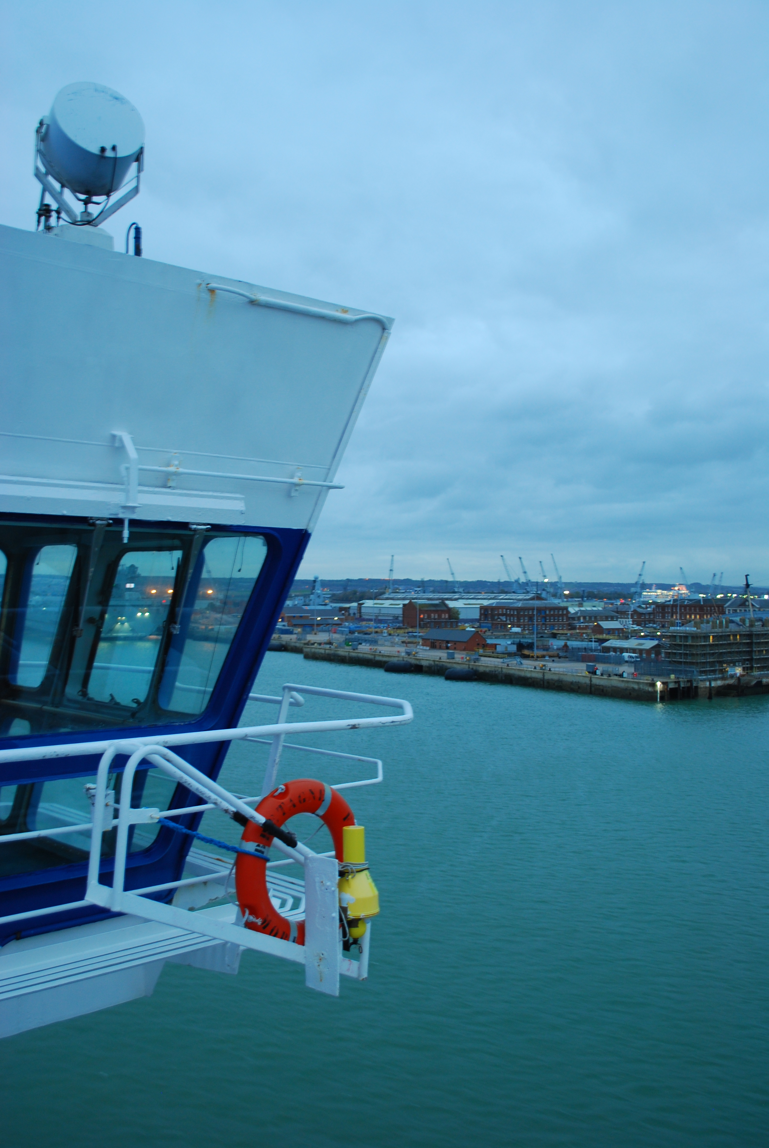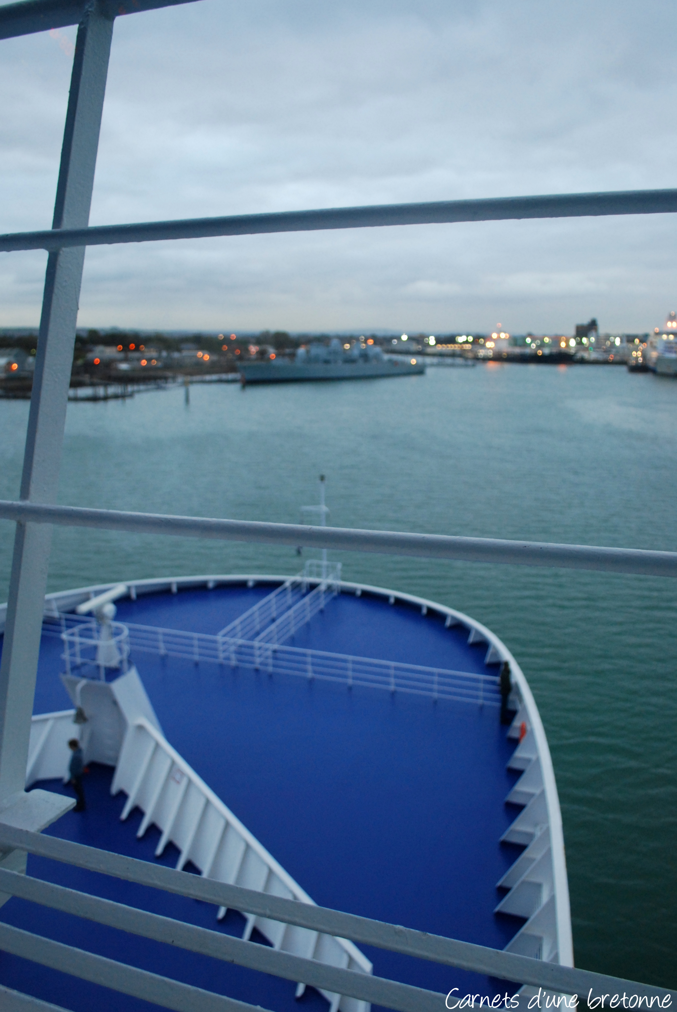 Une dernière virée sur le pont à 23h30 (soit 00h30) pour une bonne dose d’air iodé. En même temps nous en profitons pour admirer les lumières de l’île de Jersey au loin. Mais nous partons vite nous coucher pour un lever aux aurores afin de participer à l’arrivée panoramique depuis la passerelle du commandant ! La traversée de nuit est vraiment l’idéal, car la vie à bord se fait en douceur.