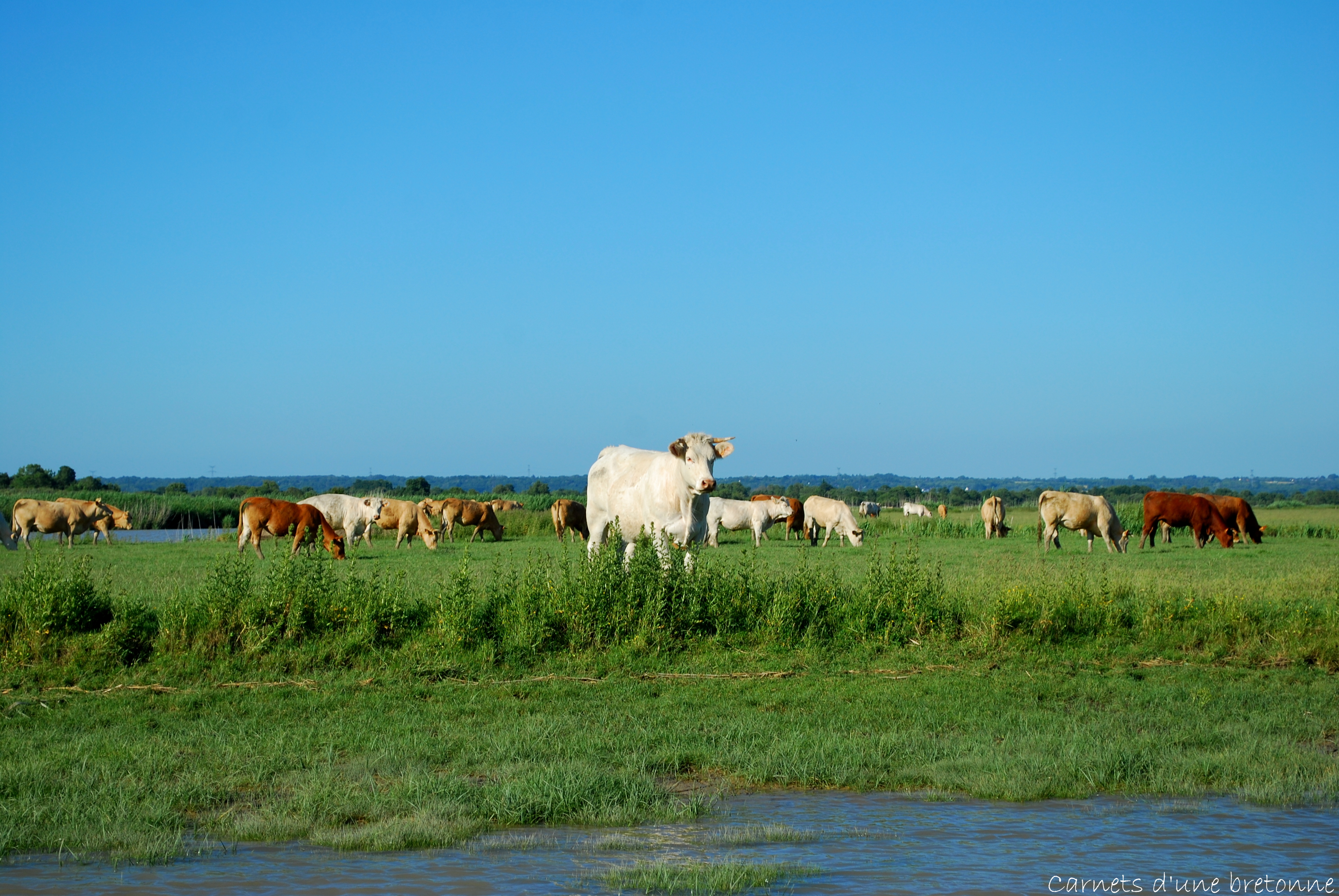 La météo étant chaude ce jour là, la fraîcheur de l’eau nous a ravit le temps de la traversée. Après quelques minutes en bateau, nous arrivons à la hauteur d’une prairie où paissent tranquillement plusieurs vaches. Intriguées voire excitées par notre passage, celles-ci sont venues nous dire bonjour… en courant ! Heureusement l’eau les a vite arrêté !
