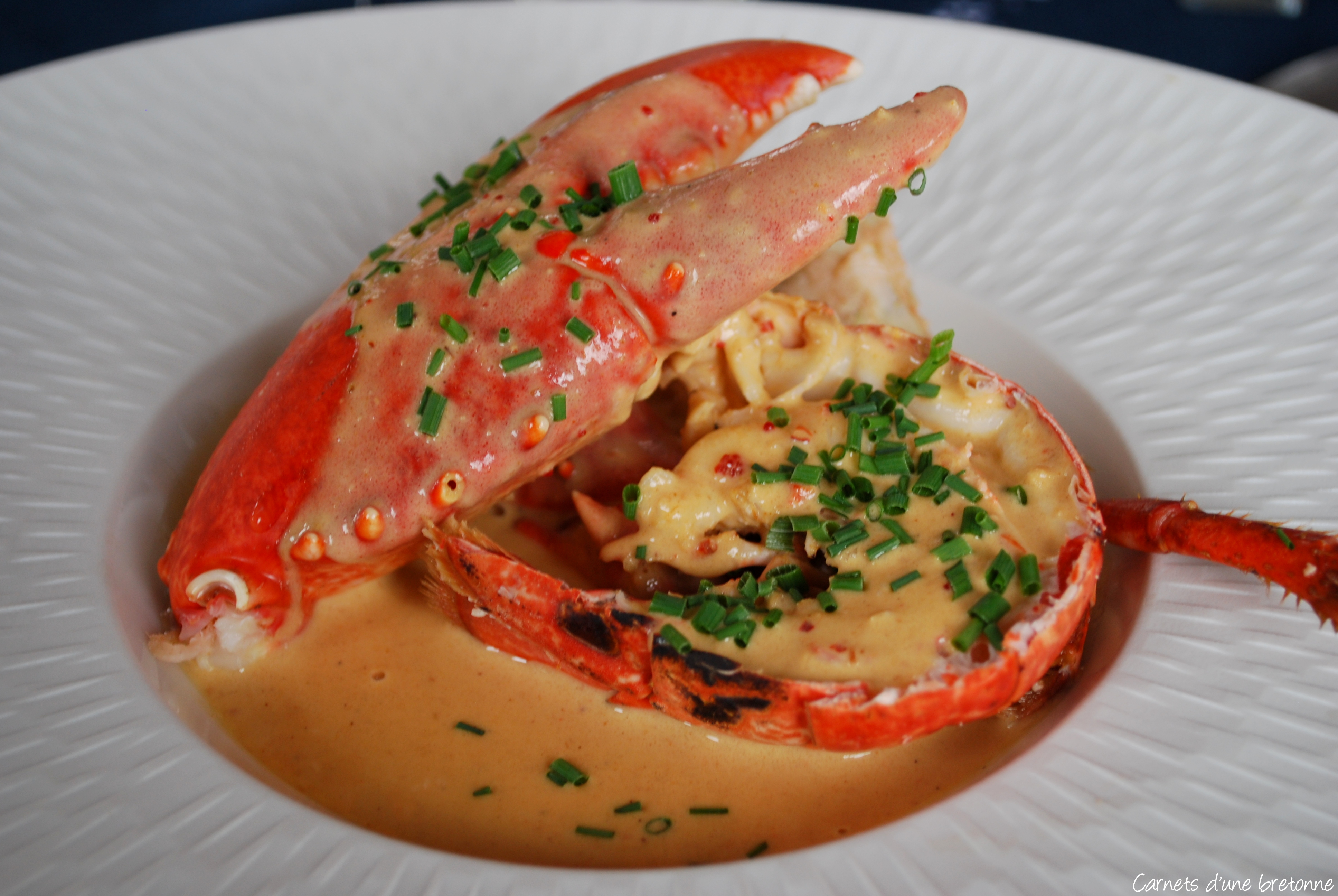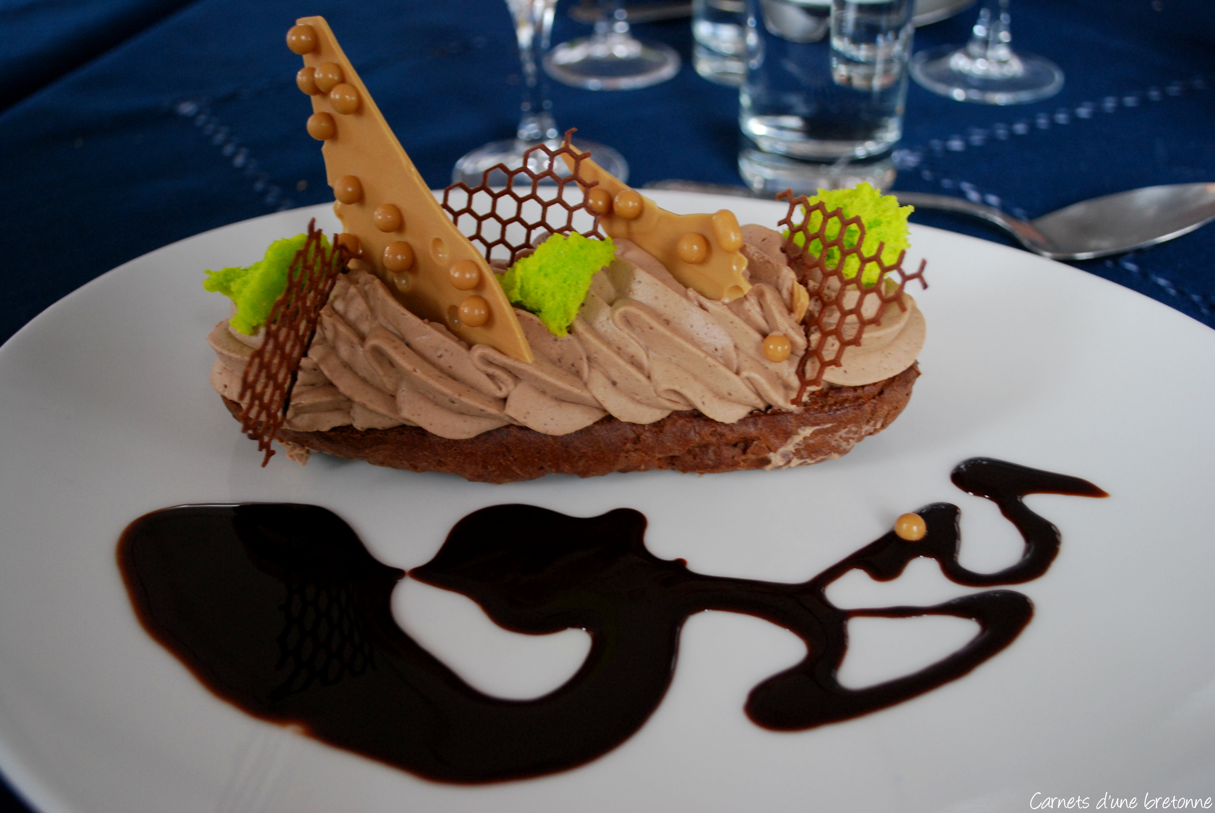 Après quelques échanges et un petit apéritif Guyader et Groix & Nature, nous avons déjeuné au restaurant éphémère. Un menu cuisiné par les deux chefs du restaurant L’Insolite. Je me suis régalée avec un demi homard à la sauce corail & riz sauvage puis en dessert un énorme éclair au chocolat !