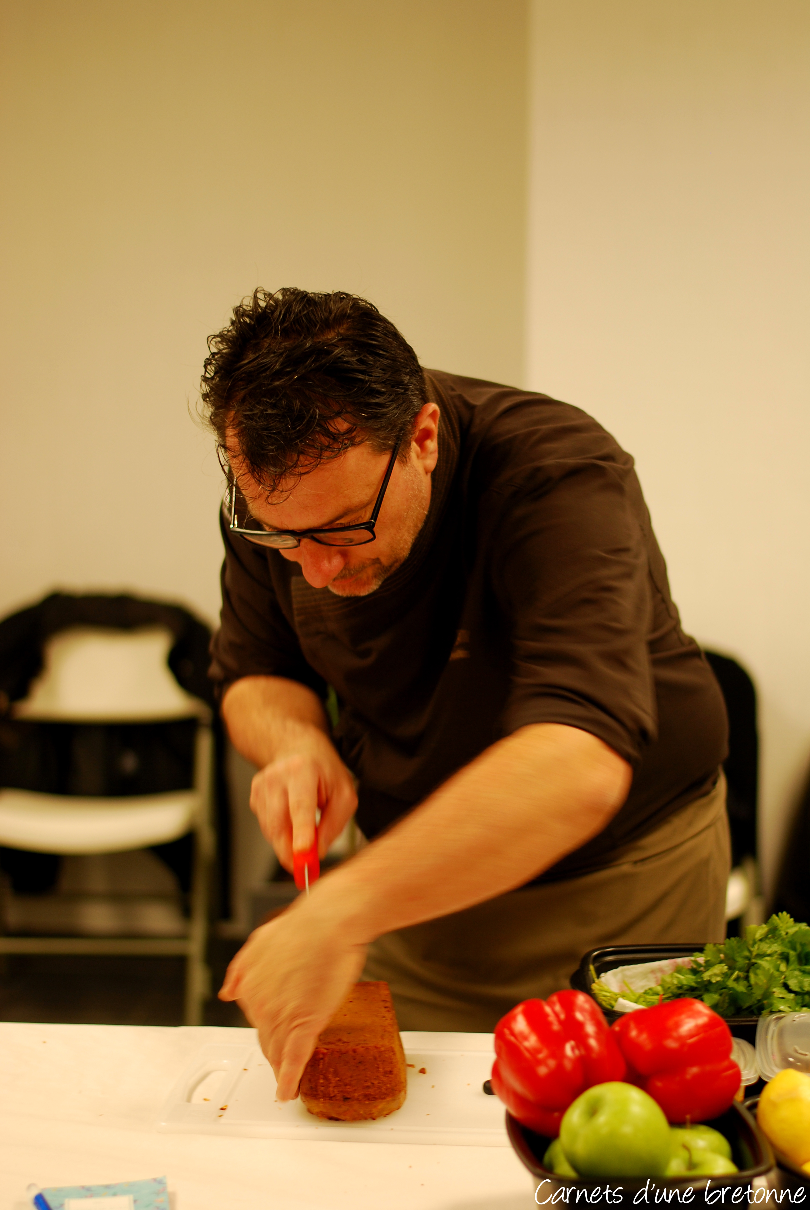 Le Chef Benoît Molin (pâtissier et créateur culinaire français) nous avait préparé trois recettes. Ma binôme et moi-même devions réaliser des Club sandwich revisités en Club Cake poivron, lard grillé, dès de chèvre, émincé de pomme verte. Pour remplacer le pain de mie nous avions utilisé des tranches de cake aux légumes du soleil.