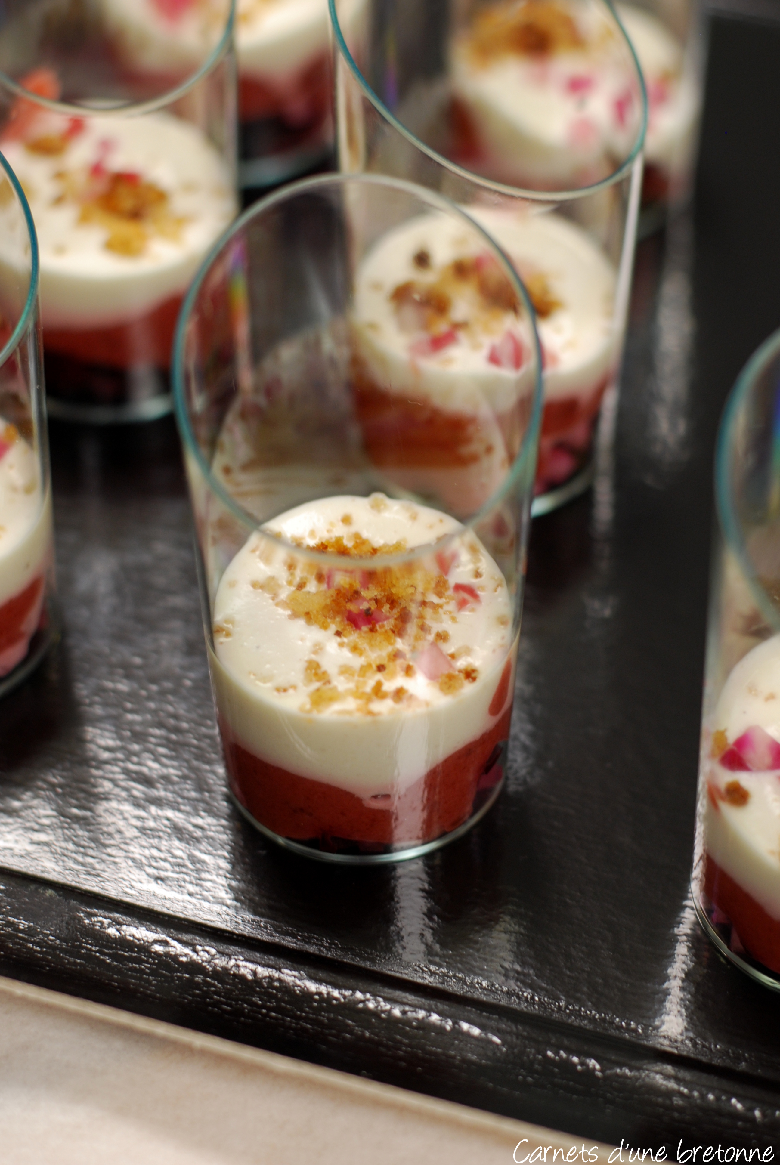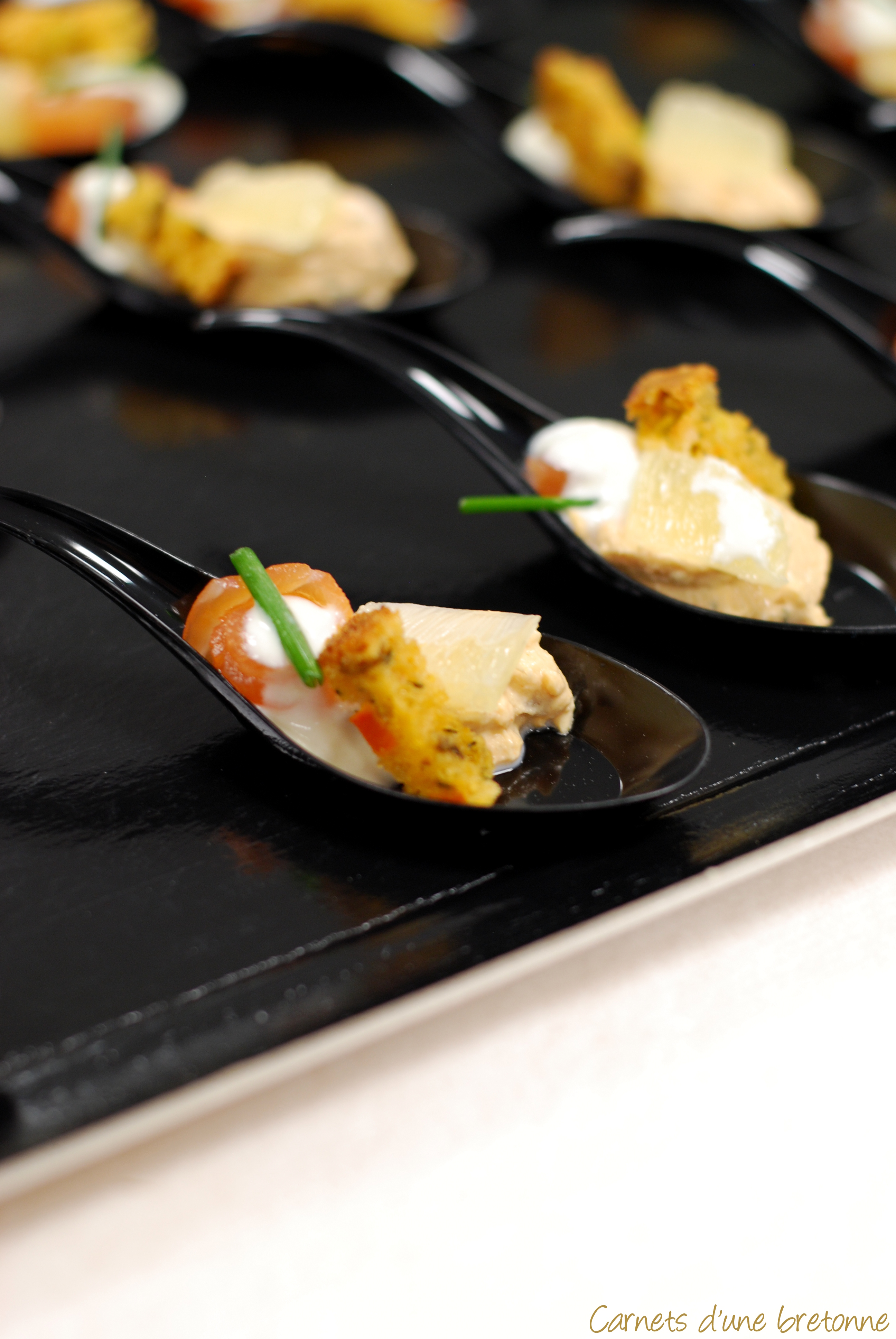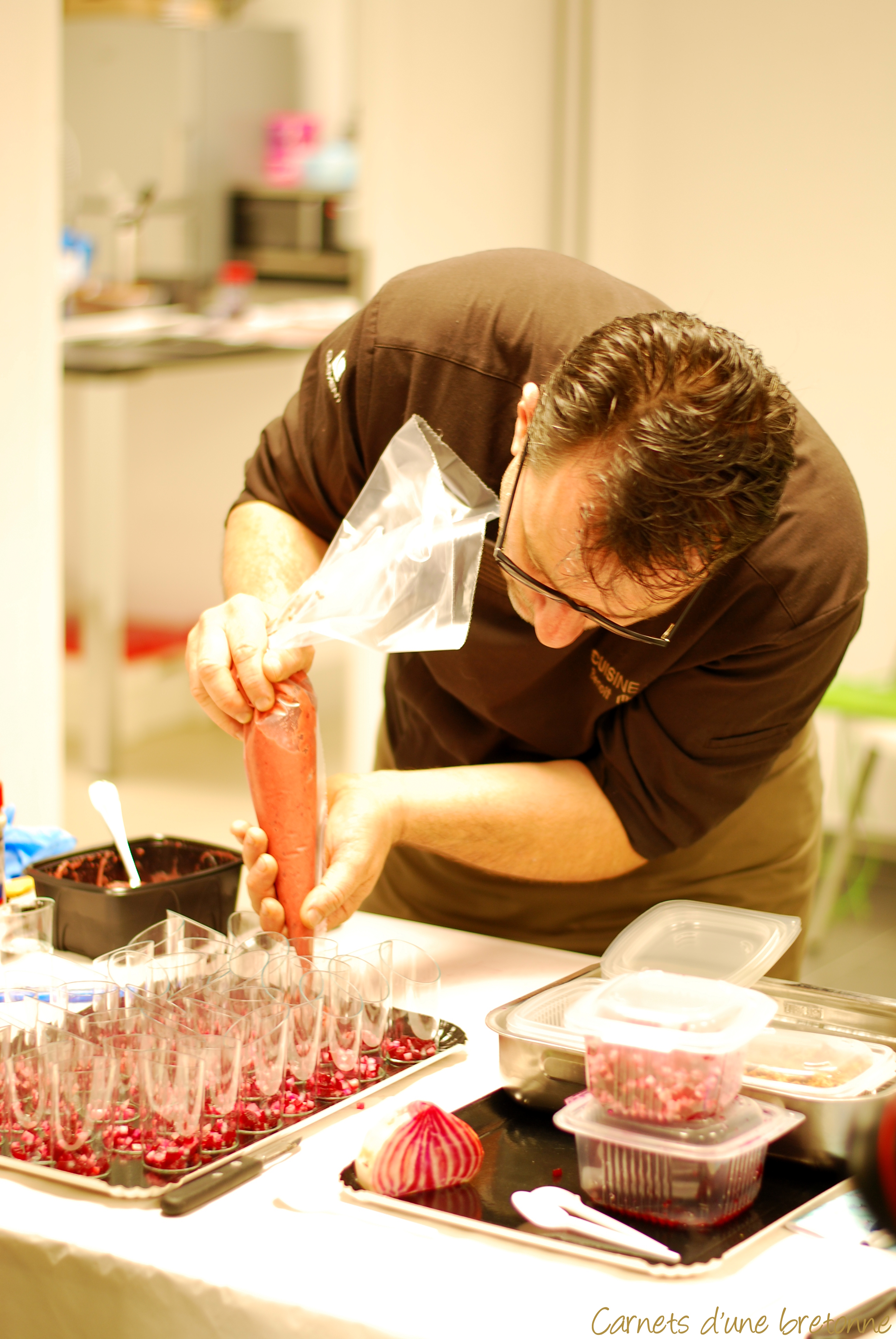 Les deux autres équipes devaient réaliser des verrines avec un tartare de betteraves, chantilly de réglisse et crumble de cake épicé & une cuillère de tartinade au saumon, crème wasabi, suprême de citron et mikado de cake.