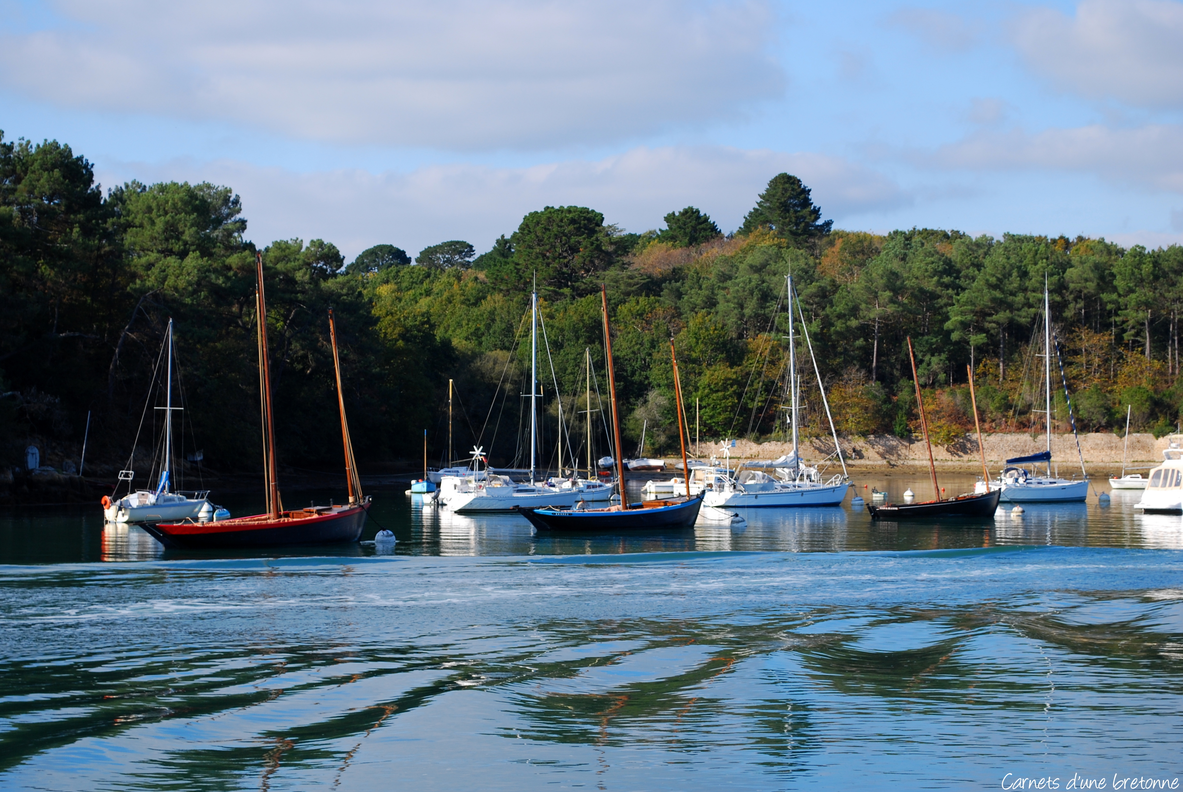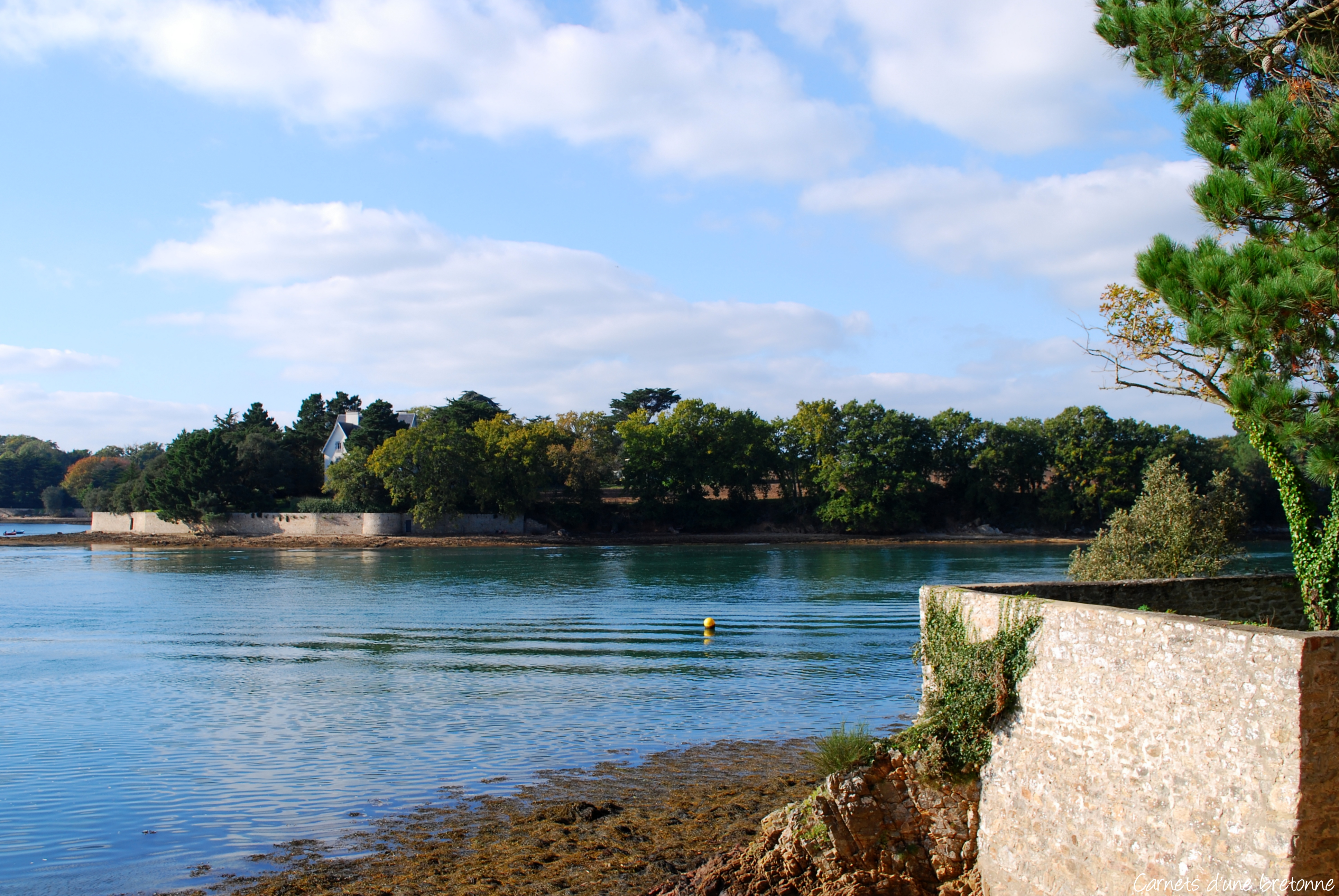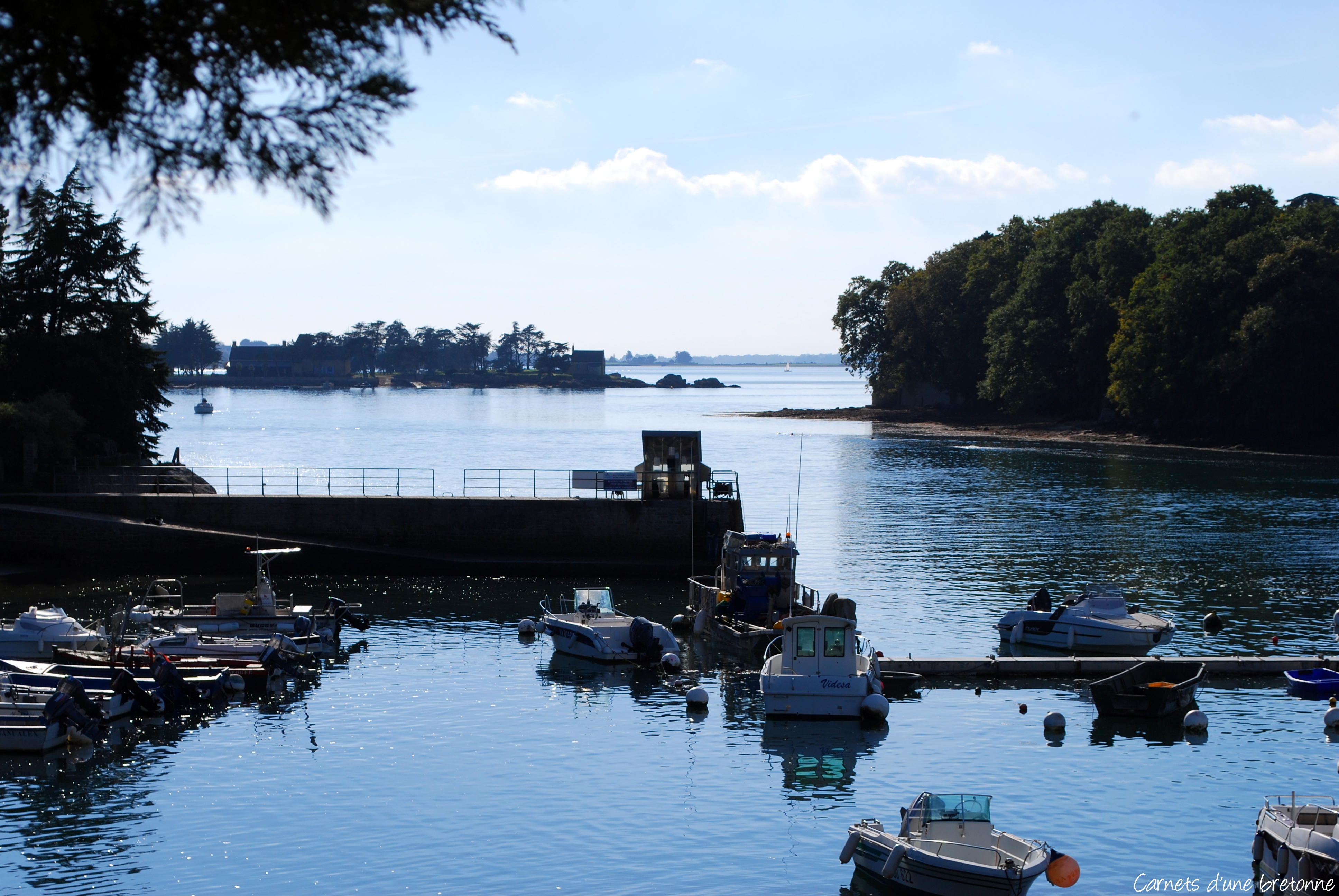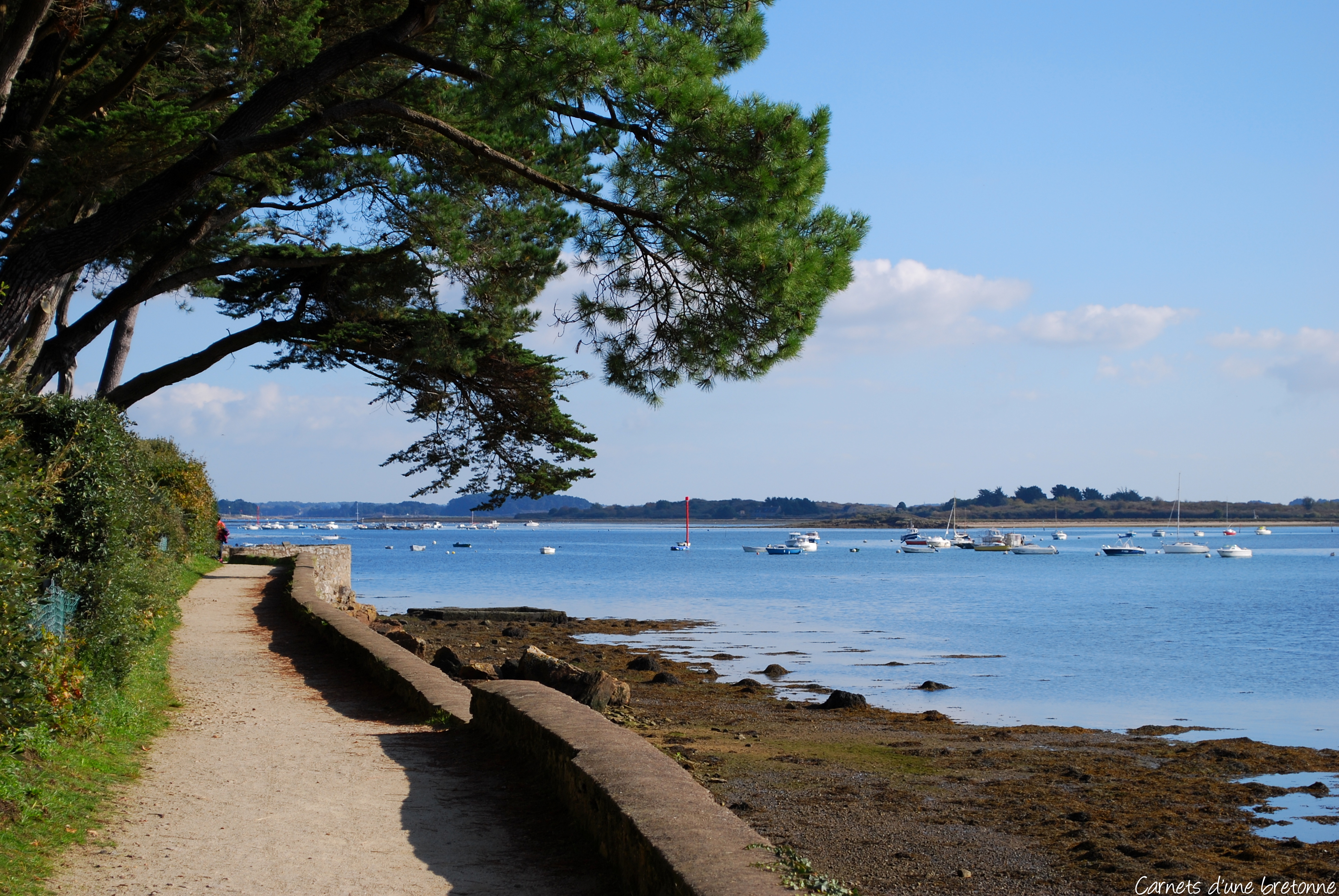Je me suis garée sur un des parkings situés à Port-Anna. À partir de là, descendez vers la cale de Barrarac’h (l’embarcadère) et tournez à gauche en longeant une mini plage. De ce point de vue, vous pouvez admirer la rivière de Vannes et la presqu’île de Conleau en face.